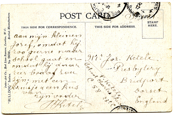 Jules was in 1902 tot priester gewijd en werkte aanvankelijk als missionaris in Plymouth. Zijn zus Margriet was zijn huishoudster. In 1914 werd Jules parochiepriester in Bridport waar hij de mogelijkheid had om zijn familie op te vangen. Naast Helena gaf hij ook onderdak aan zijn moeder, Maria Eugenia Ampe en zijn oudere zus Maria. Op 17 maart 1915 (St. Patrick’s Day) kwam daar nog Patrick bij, de vierde spruit van Helena. Vader Paul Ketele, voor de oorlog hoofdonderwijzer in Westkapelle, was gemobiliseerd als brancardier, eerst in Veurne en later in Hoogstade, maar kwam af en toe in verlof in Bridport. In 1917 werd hij tot aan het einde van de oorlog, gedetacheerd als onderwijzer naar de ‘School van de Koningin’ in Wulveringem. Hij hield heel regelmatig contact met zijn kinderen in Engeland via postkaartjes, en wisselde met de oudsten zelfs Engelse berichtjes. Zijn gezin kwam in april 1919 naar België terug. Moeder Maria Eugenia bleef na de oorlog bij haar zoon in Engeland en stierf in 1928 in Weymouth waar Jules op dat moment parochiepriester was.