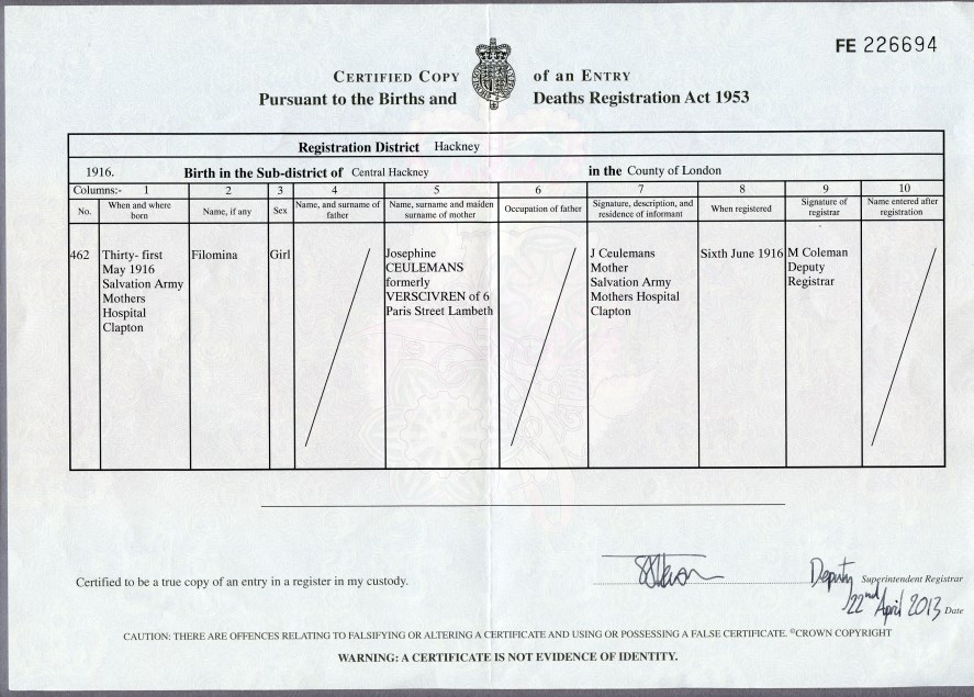 Fien vluchtte tijdens de oorlog met haar zoon en haar jongere zus Melanie naar Londen. Franciscus bleef in Antwerpen. Op 31 mei 1916 beviel Fien in het moederhuis van Hackney (Londen) van een dochter, Filomina. De vader was een andere Belgische vluchteling. Vermoedelijk nog in 1916 sterft Fien een natuurlijk dood. Ze werd in Engeland begraven. Na de oorlog keerde haar zus met de twee kinderen naar België terug. Franciscus hertrouwde en zijn zoon Frans kwam in een weeshuis terecht. Waar Filomina terecht kwam is niet geweten. In ieder geval werd alle contact tussen hen verbroken. Half-broer en -zus hebben elkaar nooit meer gezien.