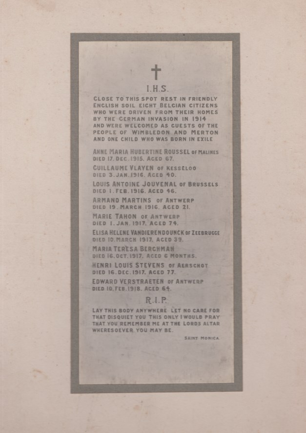 They stayed for three days in London upon arrival and then moved to Wimbledon. Mathilde Bruyninckx was employed as a domestic servant, while Henri Stevens was already too old to work. The children Hanna and Herman went to school in Wimbledon. It seems that Herman also worked at a horse breeding farm. Henri died in 1917.